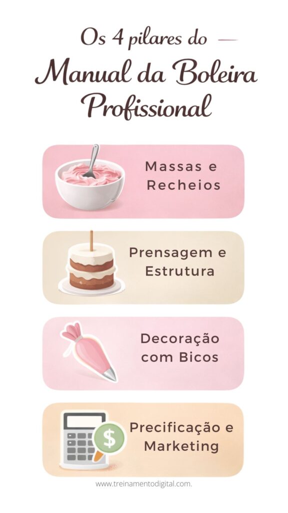 Na prática, o Manual da Boleira Profissional é um curso de boleira bem completo, pois, vai além das receitas: entra em estrutura, decoração e precificação. Ao mesmo tempo, ele também é um curso de confeitaria para quem quer profissionalizar a rotina e vender com constância, já que aborda a parte técnica e a parte de negócios.